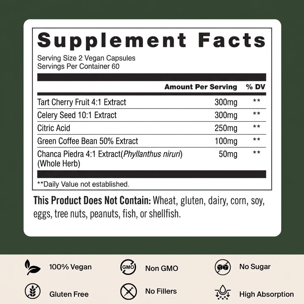 Formulated with tart cherry, celery seed, chanca piedra, green coffee bean, and citric acid, this targeted blend helps support healthy uric acid balance, kidney wellness, and the body’s natural cleansing process.