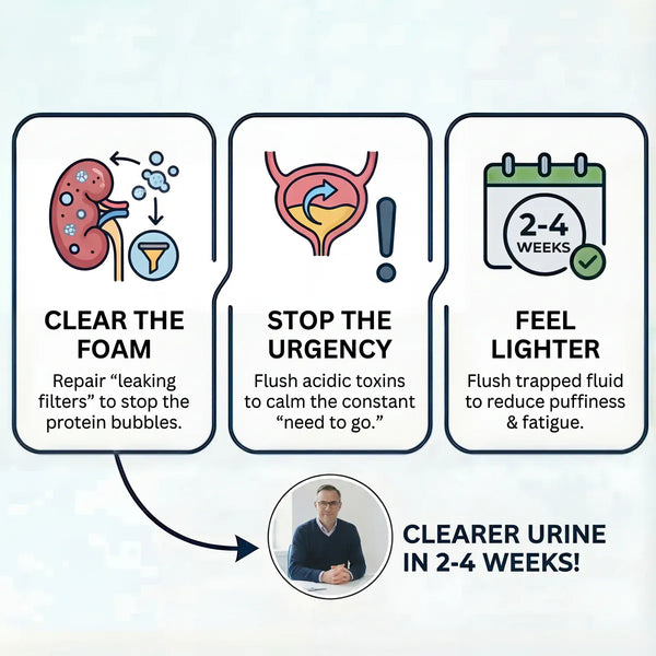 While many customers feel a "calmer" urinary urgency and less bloating within the first week, deep tissue repair takes time. We recommend taking it consistently for 2-4 weeks to allow the therapeutic dose to fully balance your kidney's inflammatory response. Consistency is the key to seeing clearer, foam-free urine.